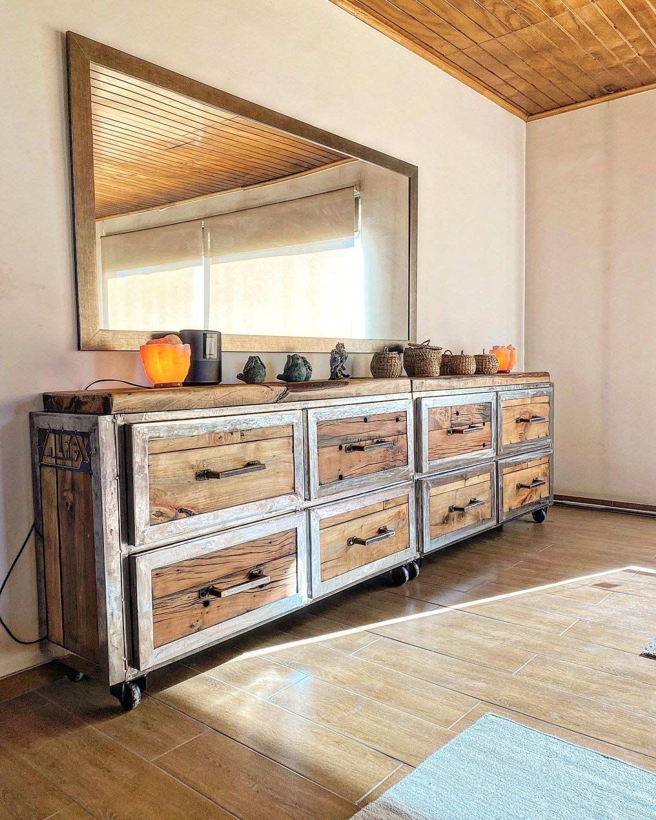 Realizada en metal calado, con un acabado oscuro que genera un fuerte contraste con la pared y proyecta sombras que cambian según la luz del entorno.